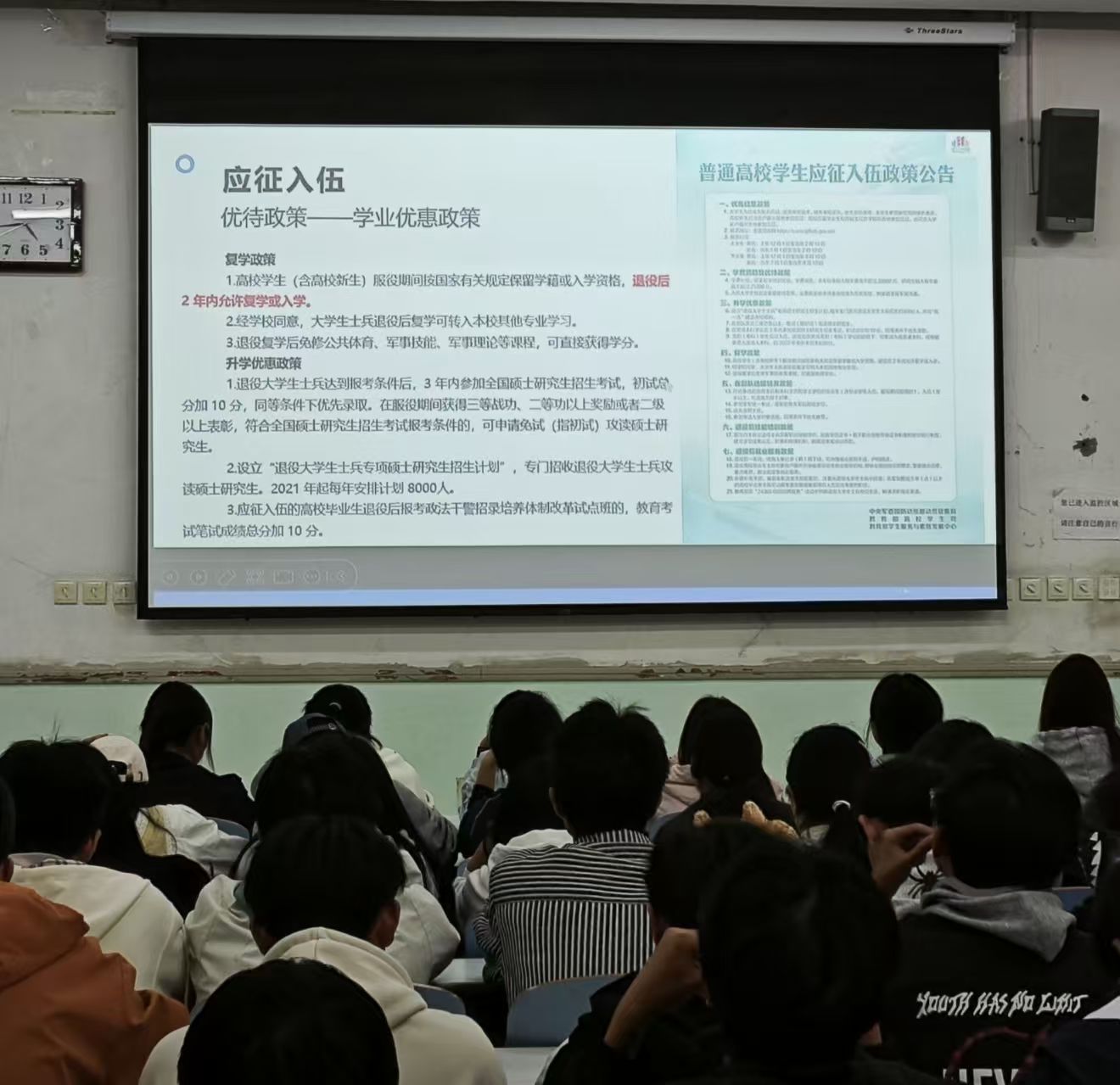 孙晴以高校征兵的重点对象为切入点,围绕入伍要求、基本流程、补助政策及优待政策逐项展开细致解读,让学生对参军路径有了清晰认知。她着重强调,青年参军不仅是实现个人成长的重要路径,更是肩负保家卫国重任的责任担当,鼓励同学们把握机遇,把爱国情、强国志转化为穿上军装、守卫祖国的实际行动。